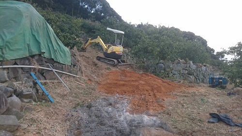 土台つくりのため、ショベルカーを使い、足りない箇所に土を運んでいます。その後、コンクリートを流して、舗装していきます。