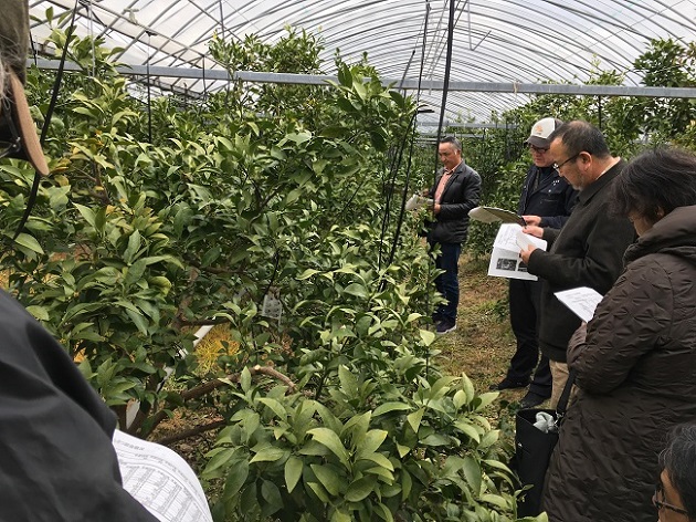 今年は福岡の生産者の圃場を見せていただいたのですが、始めてみる品種の柑橘や、施設の作り方、弊社と違う樹木の管理方法など、目から鱗のことばかりで、へーっ!という言葉ばかり発しておりました。